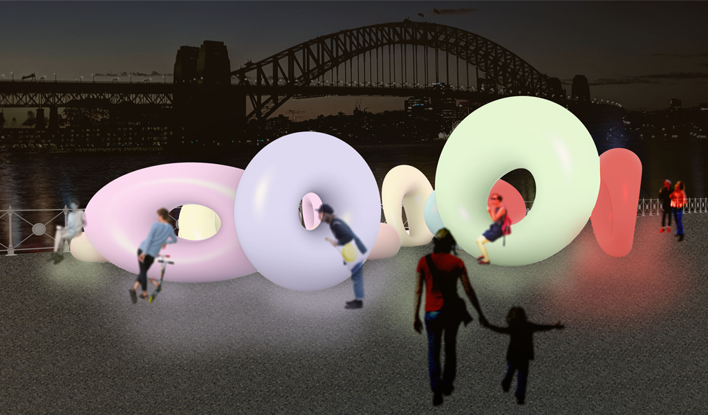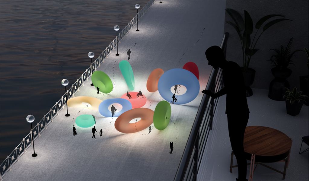 Is it possible to propose the biggest structure that uses the smallest amount of material? Confectionary is a series of 10 irregular inflatable Donut shapes. Each shape is individual, creating an undulating scale and unique individual pieces to enhance interaction. Air candy is carefully curated to disorientate your movements while also allowing you to sit, climb and move through the installation as lights react to your movements. The higher the density of people experiencing ‘Confectionery’ the high intensity the objects react.
